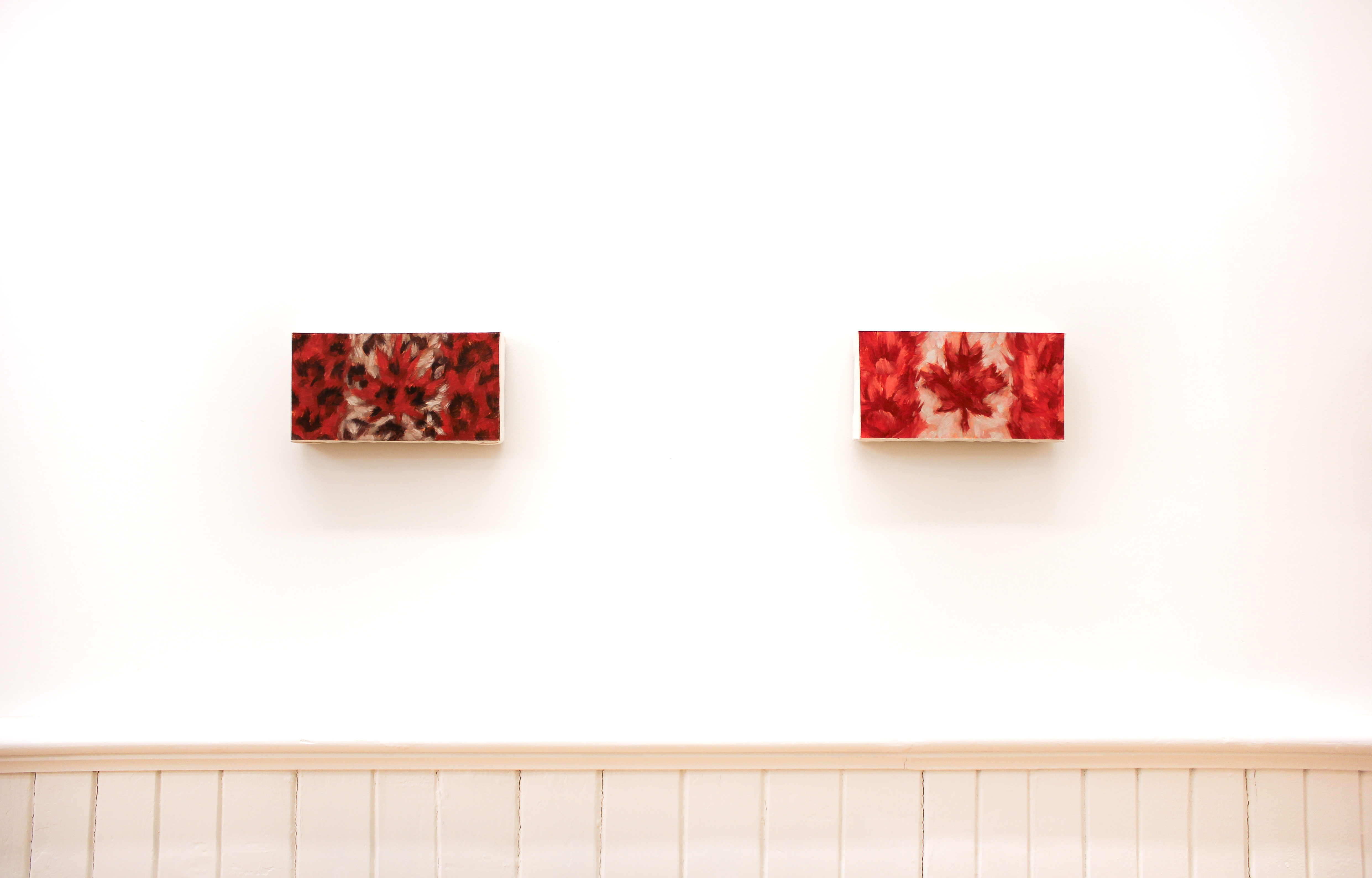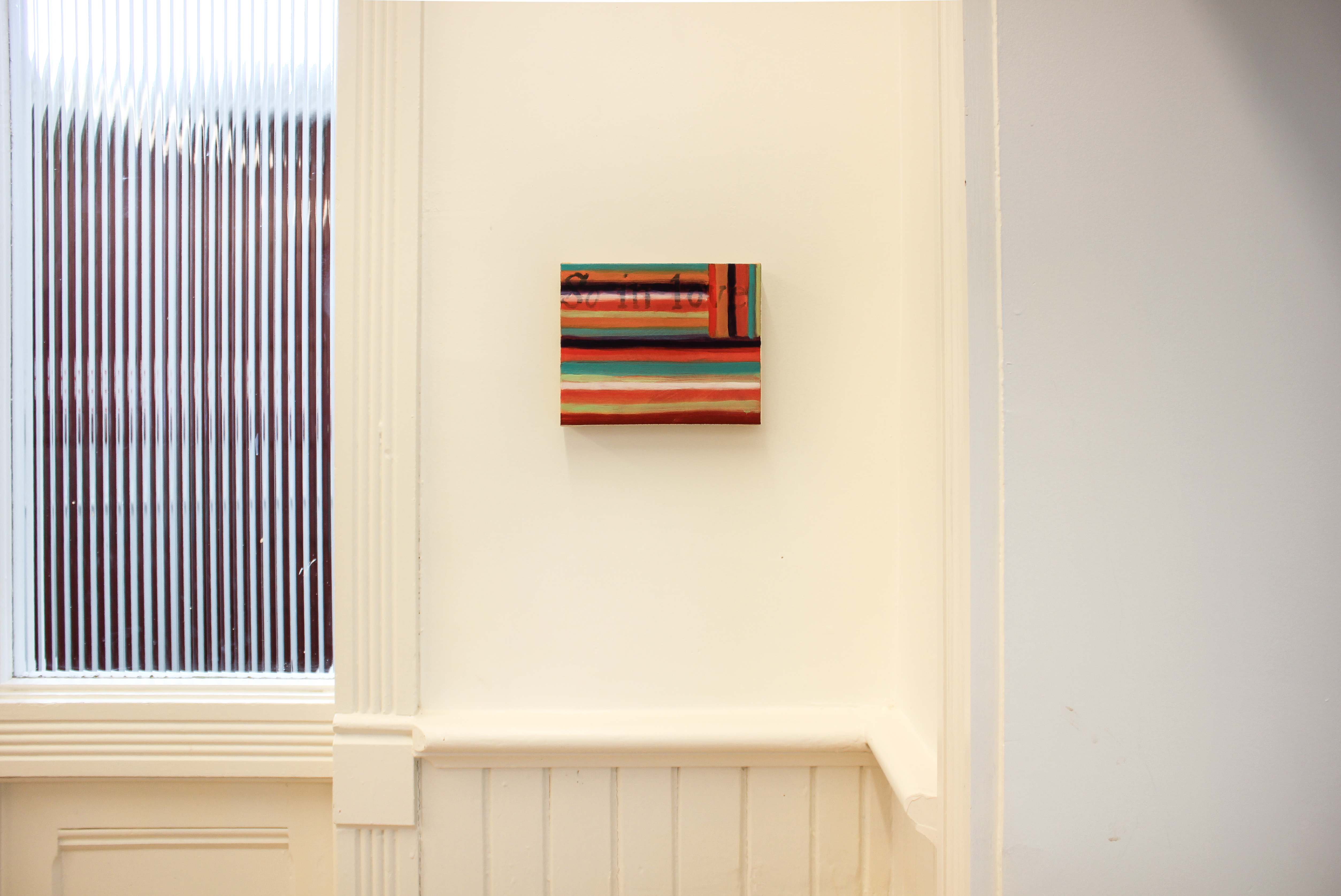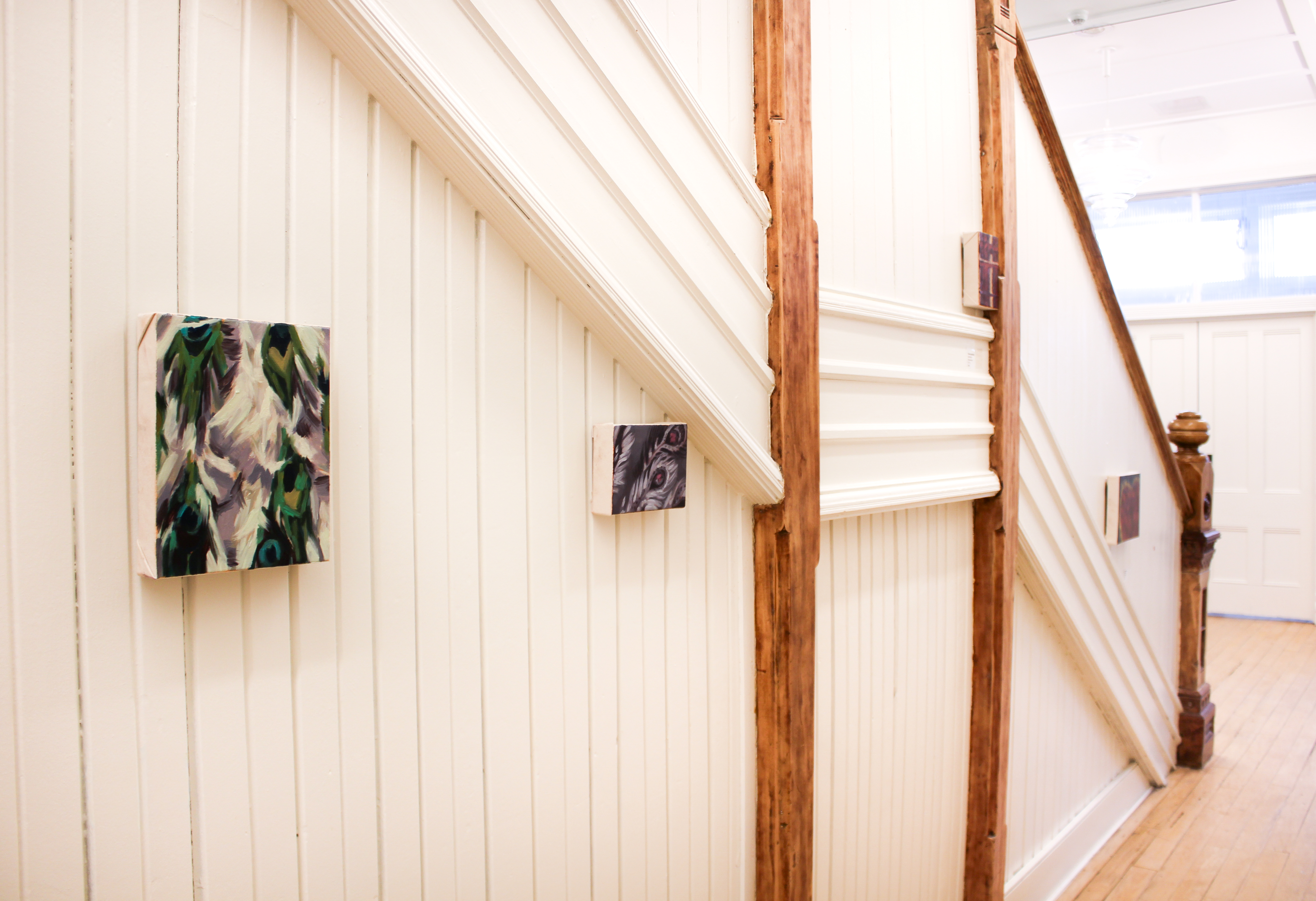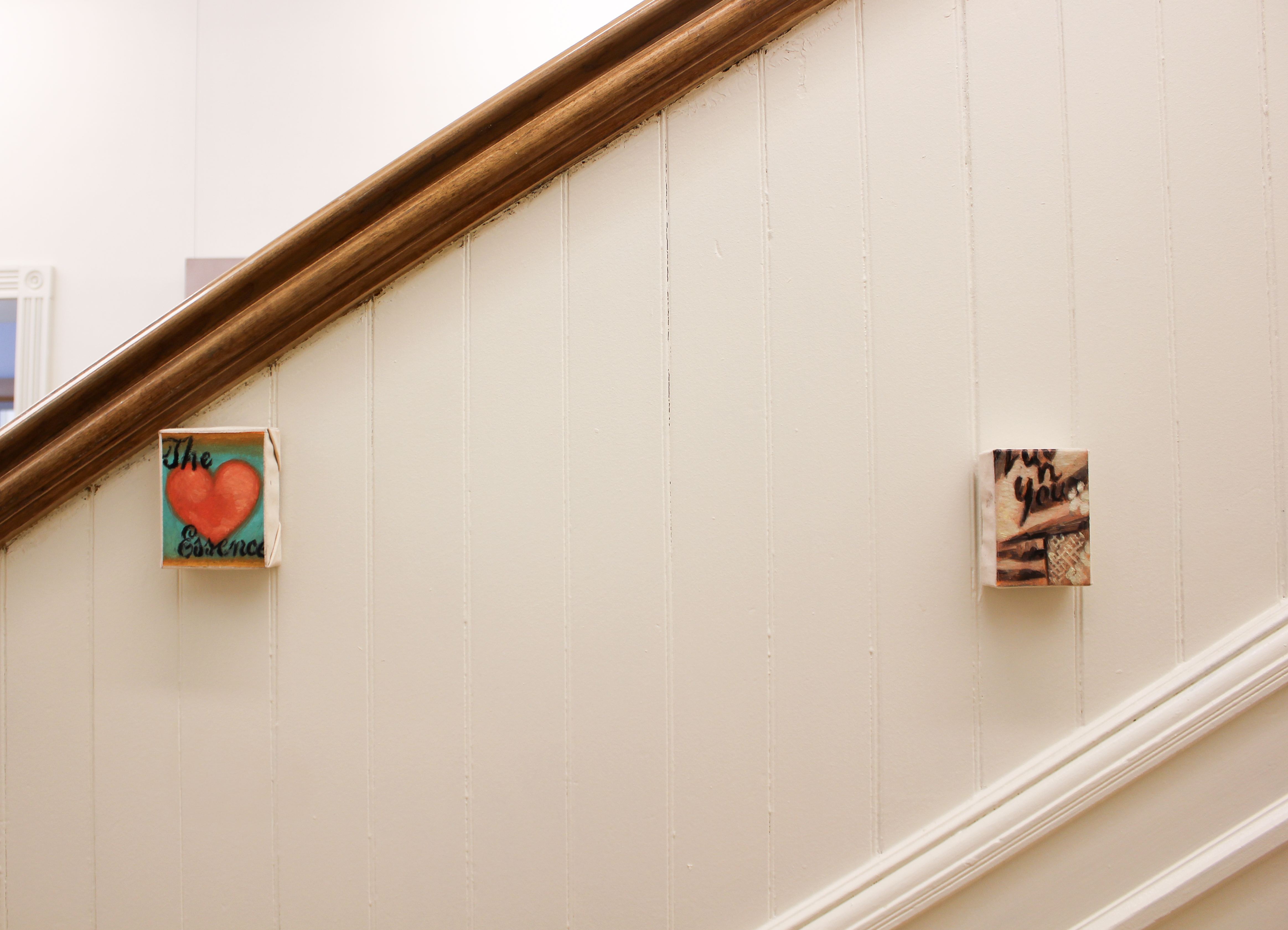 (From exhibition text) As part of her three-month residency at the Aurora Cultural Centre, Julia used gestural painting and physical cropping to explore the formal and conceptual aspects of the term kitsch, contemplating its implications in advertising, identity, and the canon of art history. Through references to found imagery from magazines and the internet, she investigates the ways how accessible visual material can be manipulated and transformed to express critical thought.